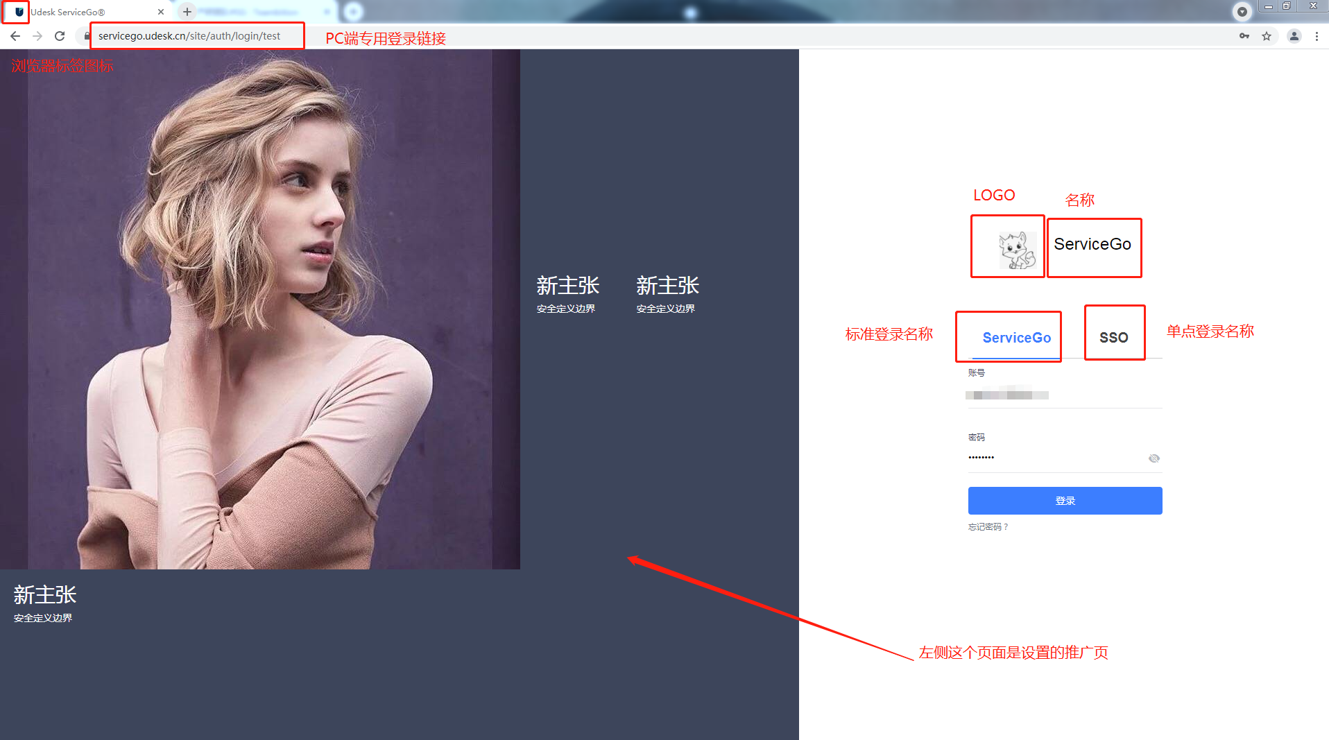 | 标准登录名称 | 是 | 输入后,在专用登录页展示标准登录为该名称 | ServiceGo |