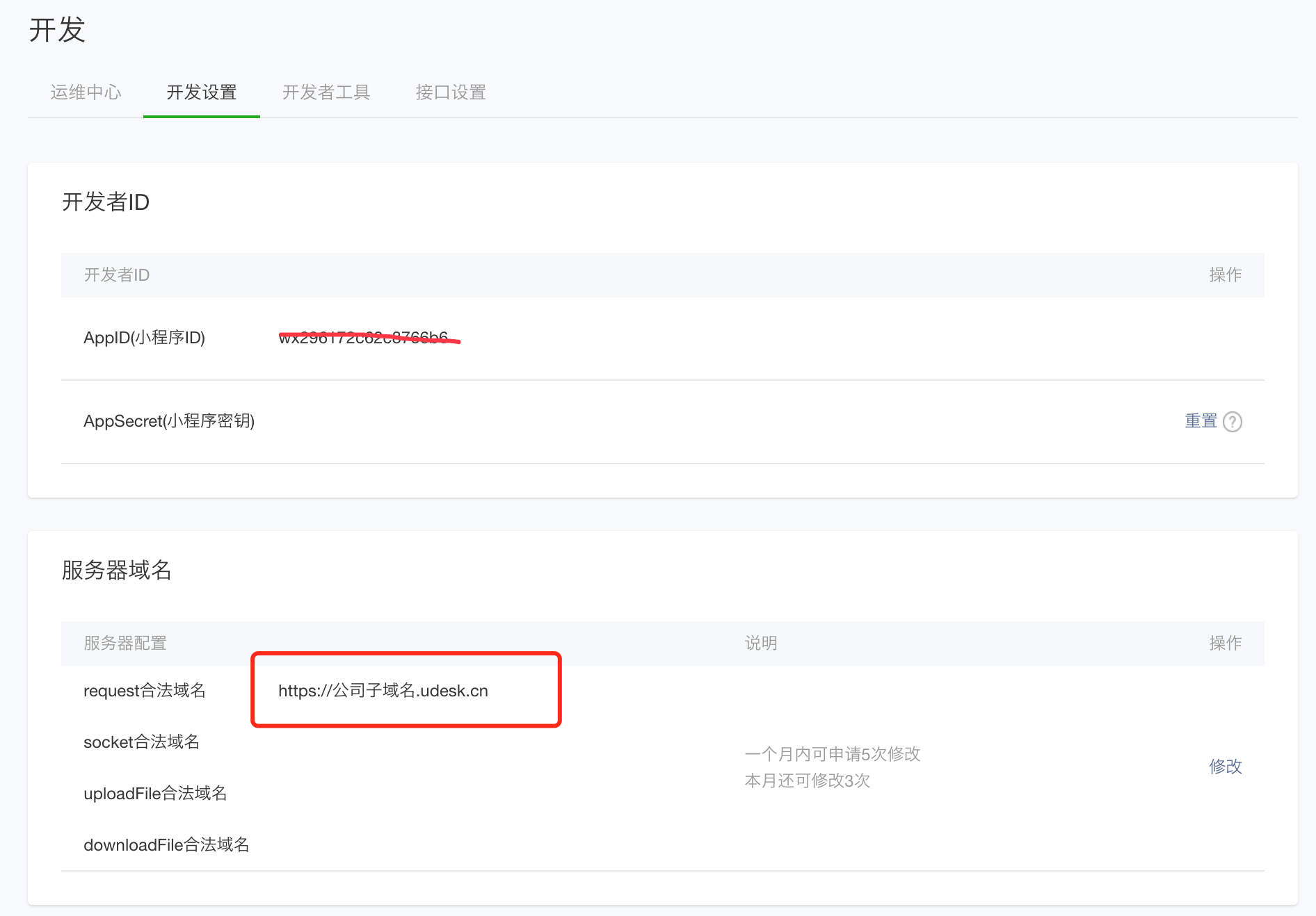 - 进入udesk: 管理中心->渠道管理->小程序->接入微信小程序 填写开发者ID、开发者密码